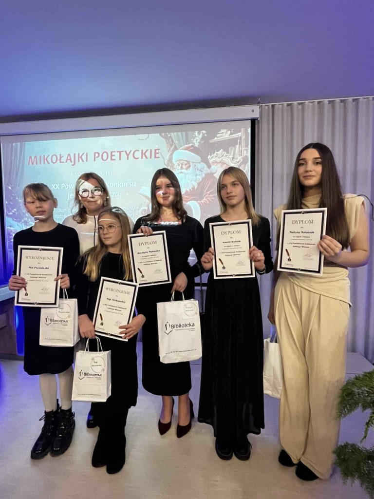 W poniedziałek pięcioro uczennic naszej szkoły: Martyna Matuszak, Krystyna Matoszko, Matylda Nawrocka, Amelia Kubiak, Inga Aleksander oraz Maja Pszeniczka wraz z panią Beatą wzięło udział w Mikołajkach Poetyckich w Bibliotece Publicznej im. H. Święcickiego w Śremie w ramach podsumowania XX Powiatowego Konkursu Jednego Wiersza, zajmując zaszczytne miejsca na podium bądź wyróżnienia. Jesteśmy dumni z naszych młodych poetek, tym bardziej, iż fragment wiersza Amelii Kubiak posłużył jako tytuł tegorocznego tomiku „Nie poddawaj się, jeszcze raz…”.